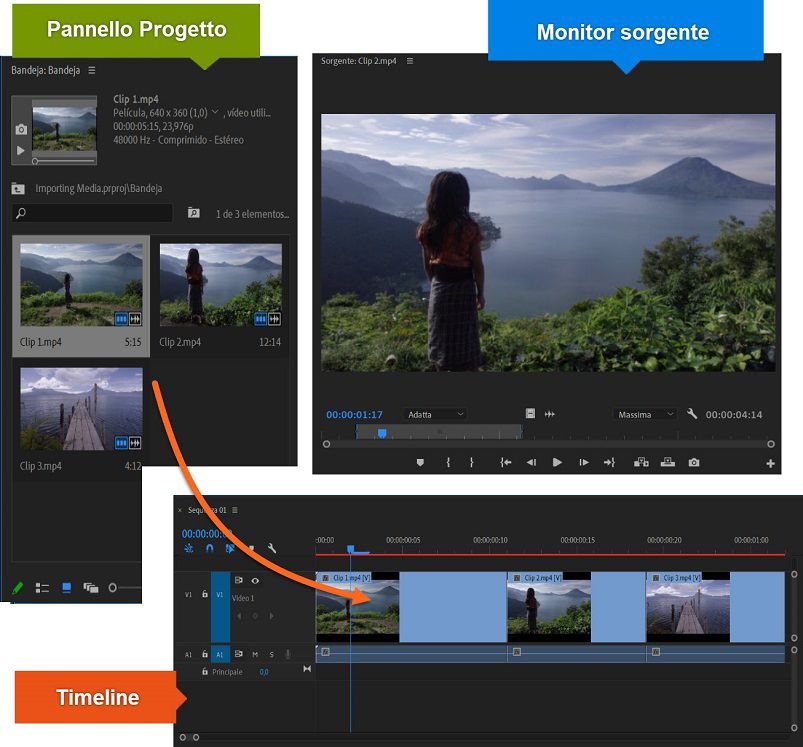 Per visualizzare una clip nel monitor Sorgente, fai doppio clic sulla clip nel pannello Progetto. Nel monitor Sorgente puoi visualizzare le clip, impostare punti di montaggio e contrassegnare i fotogrammi prima di aggiungere delle clip a una sequenza. Perfeziona le sequenze manipolando le clip nel pannello Timeline.