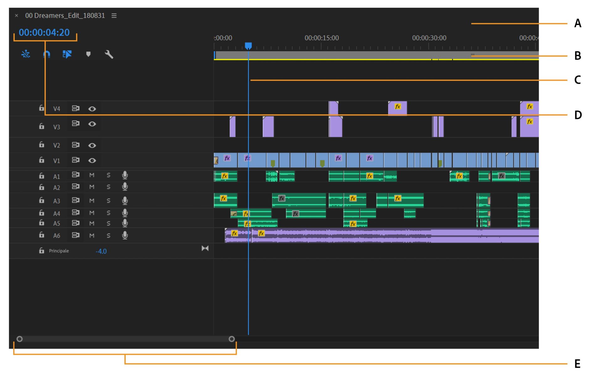 Per scambiare le sequenze, nel monitor Programma o nel pannello Timeline fate clic sulla linguetta della sequenza che volete utilizzare. La sequenza diventa la scheda in primo piano in entrambi i pannelli.