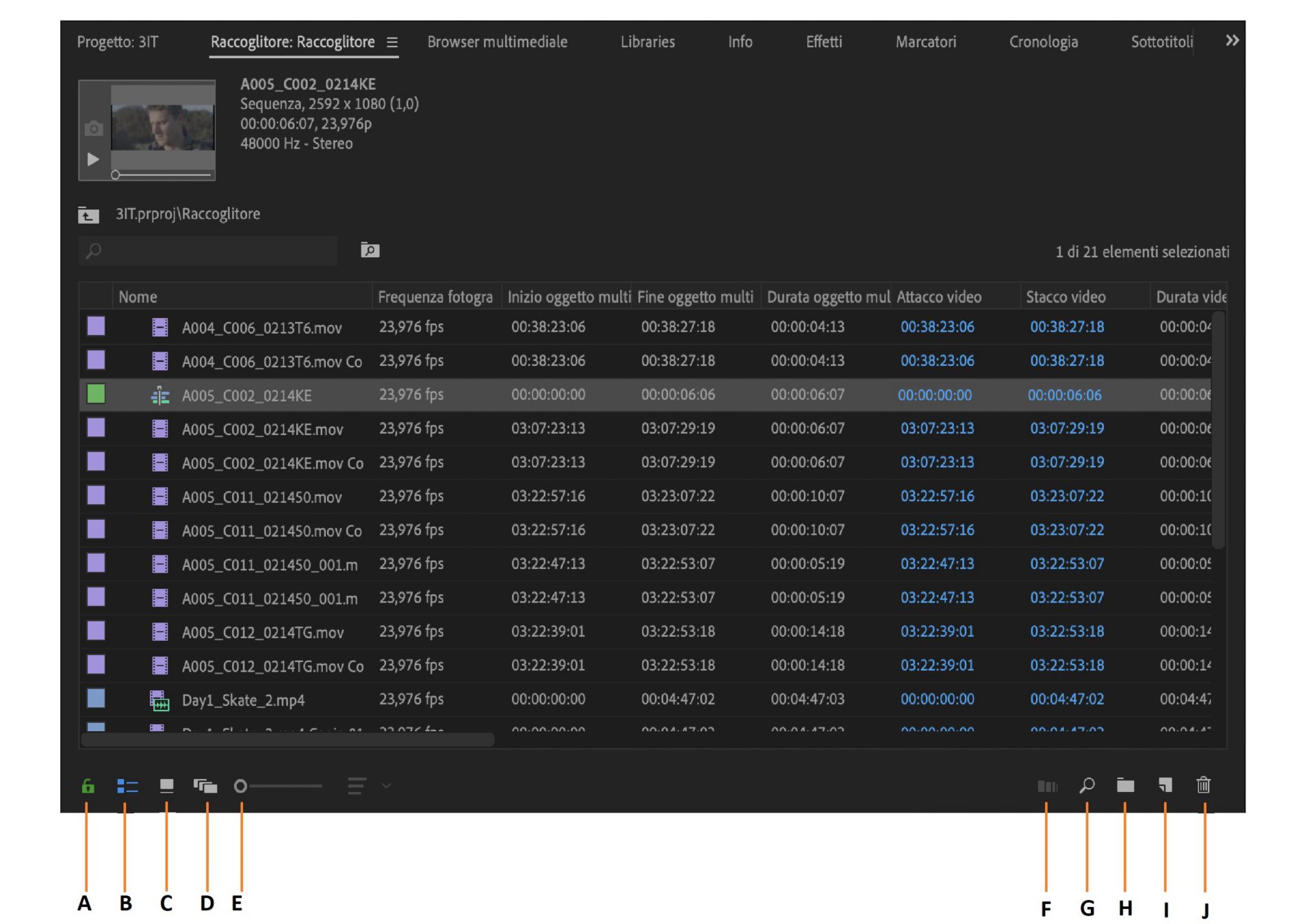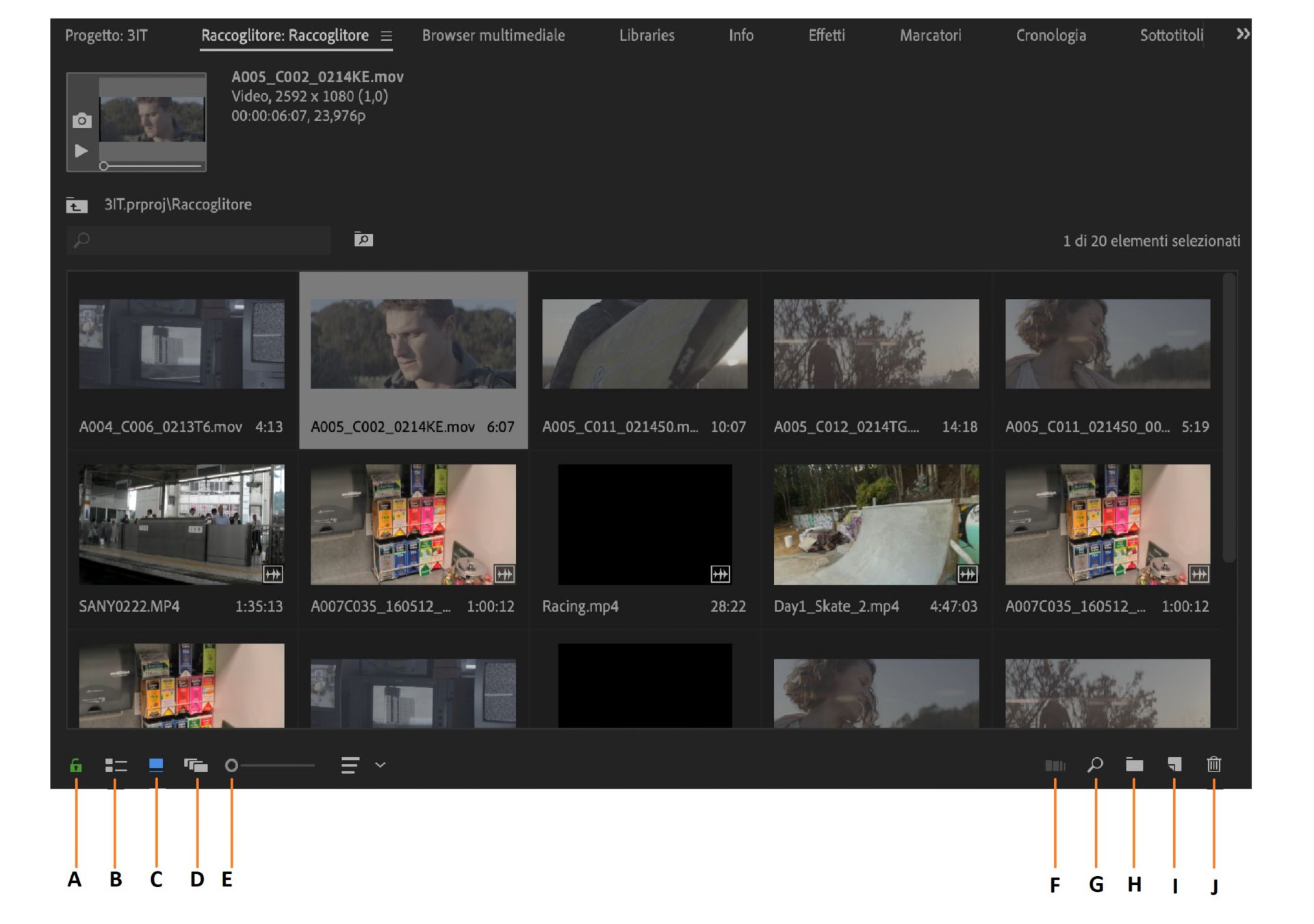 La Visualizzazione a icone di Premiere Pro offre le seguenti funzioni: