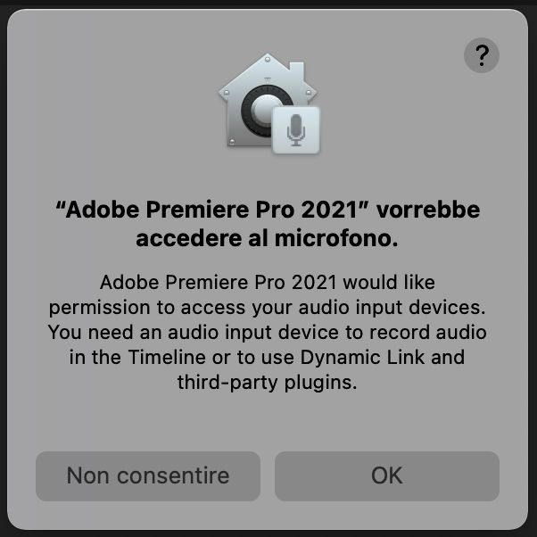 macOS 12 Monterey e Windows 11 presentano nuove funzionalità di privacy per le applicazioni che accedono ai dispositivi audio. Gli utenti di Premiere Pro, After Effects, Audition e Character Animator noteranno questi cambiamenti quando utilizzano le applicazioni in questi sistemi operativi.
