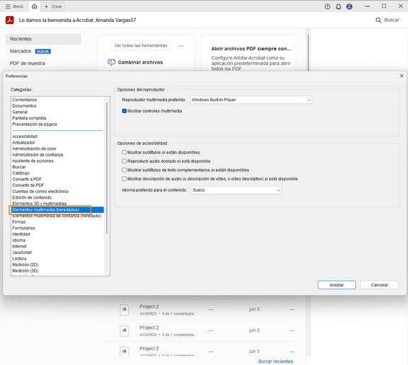 Debe configurar las preferencias multimedia para los dos tipos siguientes de archivos PDF: