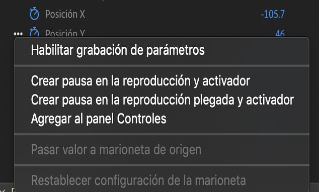 ) y seleccione Habilitar grabación de parámetros. Cuando esta opción está habilitada, aparece un punto rojo junto al parámetro.  Si modifica el valor del parámetro durante una grabación, se creará una nueva toma que contendrá todos los cambios. Para obtener más información sobre las tomas, consulte Grabar tomas. Cuando un parámetro tiene fotogramas clave y tomas, las tomas tienen prioridad.