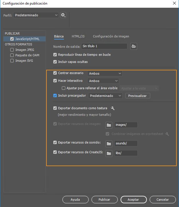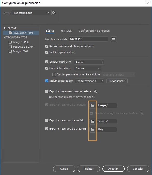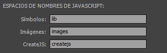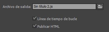 - Especifica que no se exporten los recursos del archivo FLA, anulando la selección de las opciones de exportación de recursos para imágenes, sonidos y bibliotecas asociadas de JavaScript de CreateJS y usando las URL relativas para exportar.
