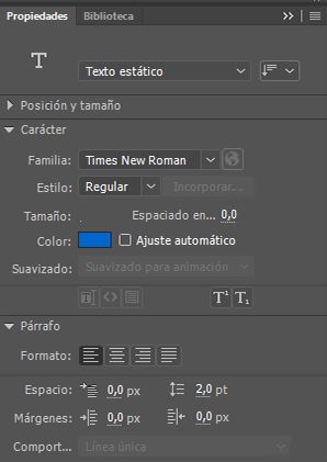 El texto dinámico permite modificar el texto en tiempo de ejecución y no aumenta demasiado el tamaño del archivo. Admite menos opciones que el texto estático. También admite fuentes web mediante Adobe Fonts.
