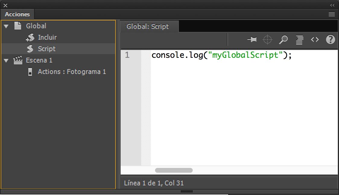 En el panel Acciones, seleccione Script en la jerarquía Global. La sección Script global permite escribir scripts aplicables a los documentos de Animate o como script externo. Como script externo: en la pantalla Incluir, seleccione el script específico para la inclusión, tal como se describe en la sección siguiente.