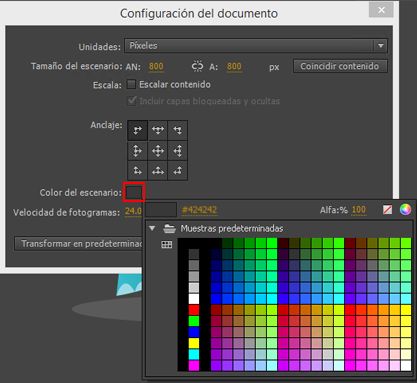 - Seleccione Modificar>Documento>Color del escenario o, en el Inspector de propiedades, seleccione Configuración avanzada.