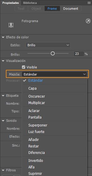 Para aplicar modos de mezcla en un determinado fotograma, en primer lugar seleccione el fotograma y elija uno de los modos de mezcla que aparecen en la sección Visualización del panel Frame properties (Propiedades de fotograma).