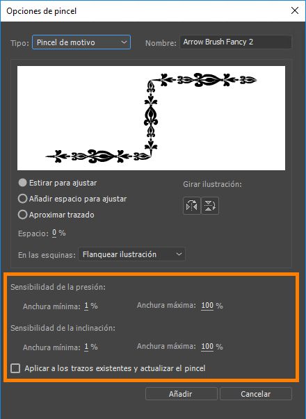 - Estirar para ajustar a la longitud del trazo: para ampliar el pincel de acuerdo con la longitud del trazado que está dibujando.