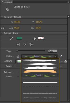 Seleccione una forma en el escenario y modifique su estilo de trazo eligiendo un estilo de trazo del Pincel de ilustración en el panel de Propiedades.