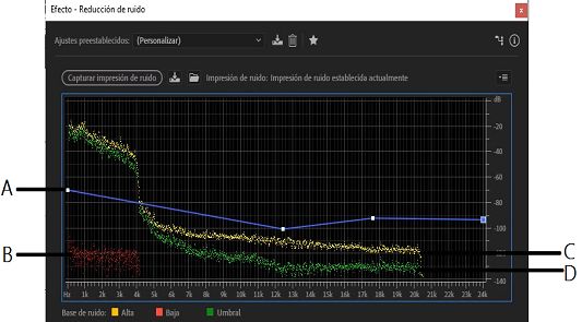 A. Arrastre los puntos de control para variar la reducción en diferentes rangos de frecuencia B. Ruido de amplitud baja. C. Ruido de amplitud alta D. Límite bajo el cual se produce la reducción de ruido.