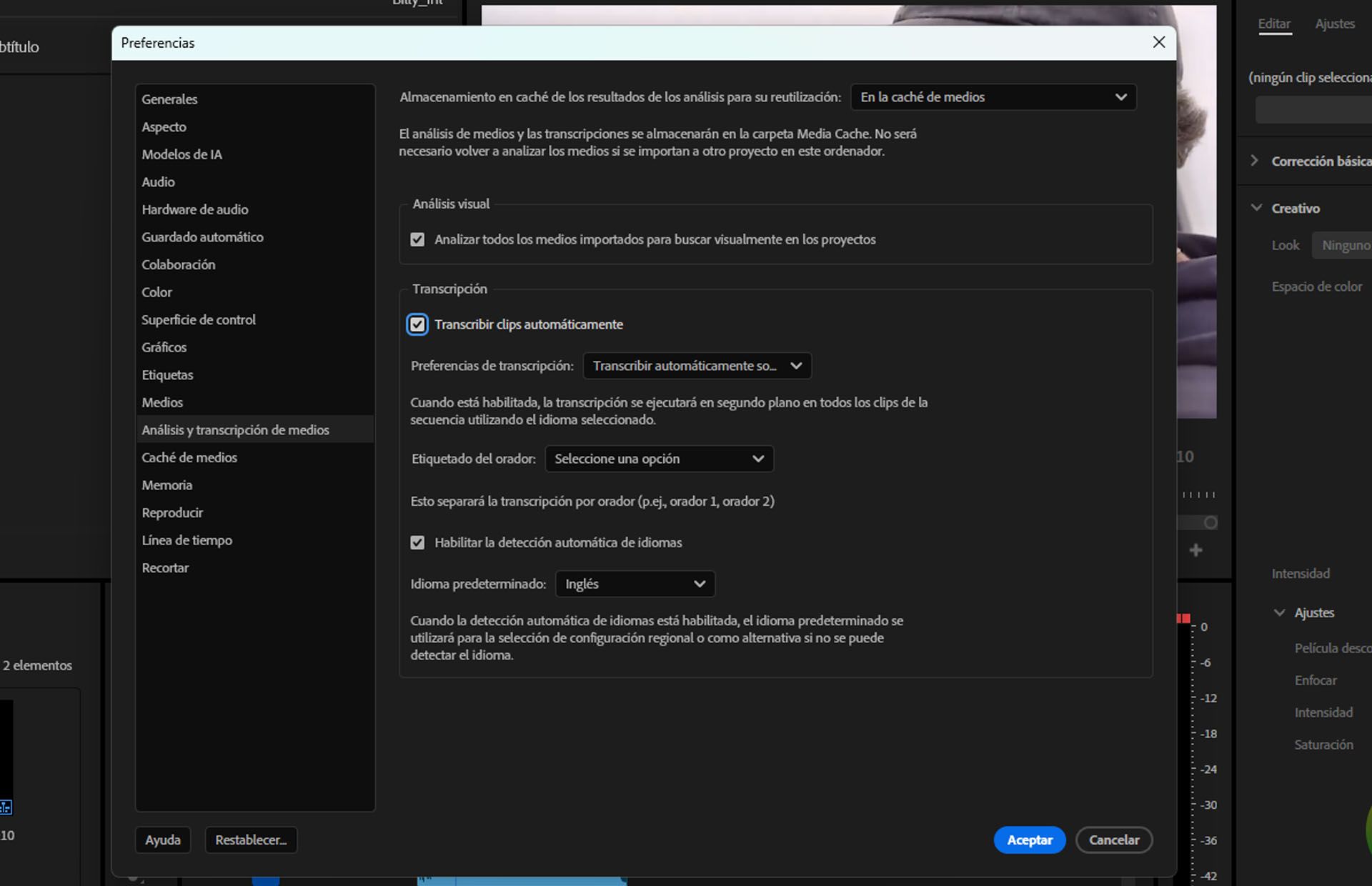 La nueva sección de preferencias Análisis y transcripción de medios tiene opciones de Transcripción existentes junto con algunas de las nuevas configuraciones para administrar la función de análisis.