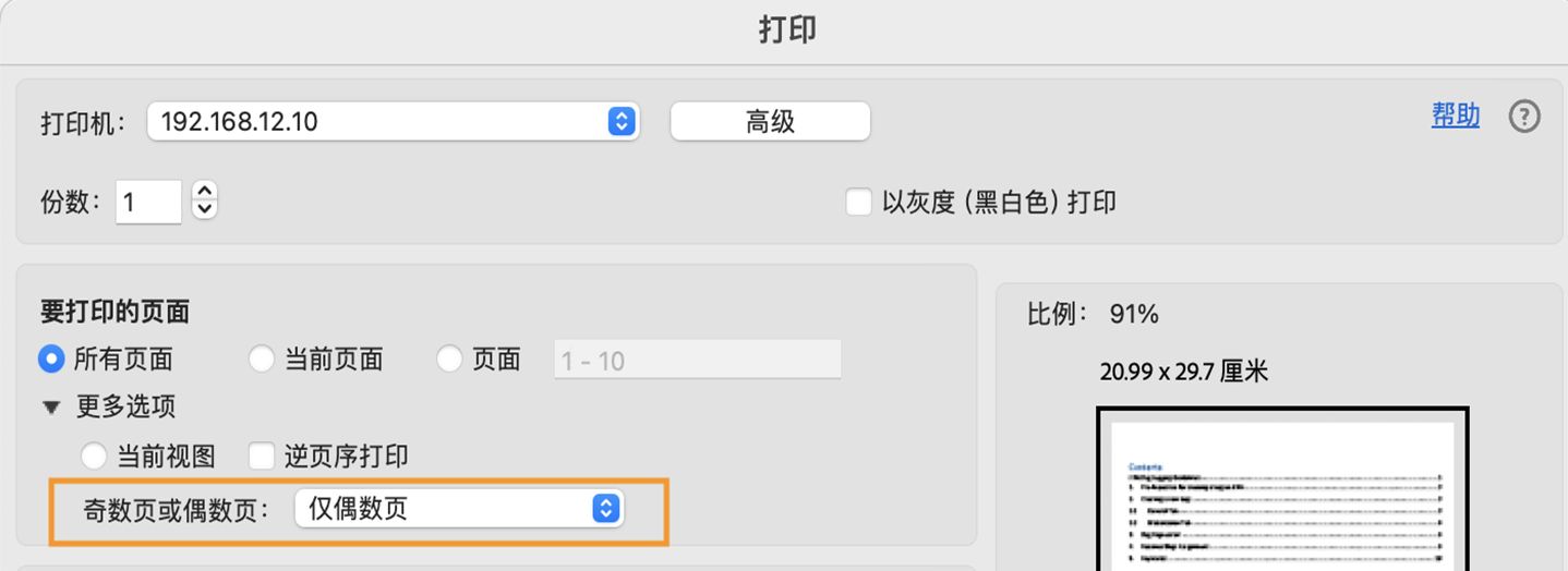 在“打印”对话框的“要打印的页面”部分中选择仅偶数页面。