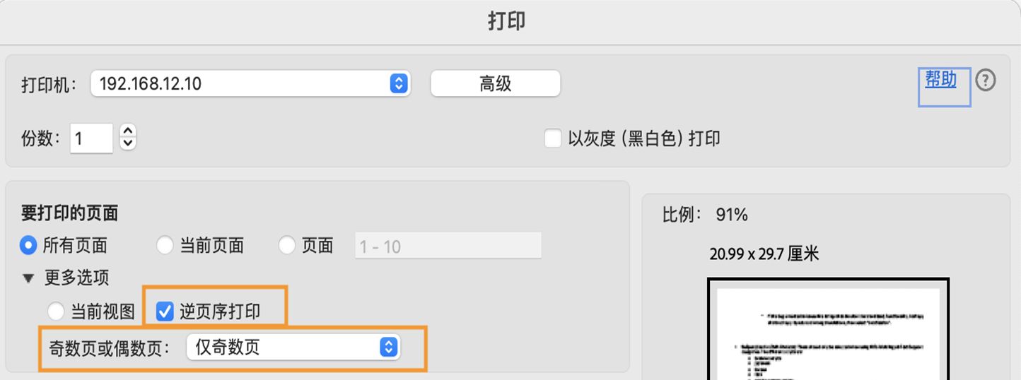 选择逆序打印,然后在“打印”对话框的“要打印的页面”部分中选择仅奇数页面。在这种情况下,“逆序打印”选项可以确保页面序号正确。