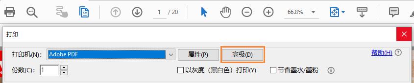 在打印对话框中,选择高级。