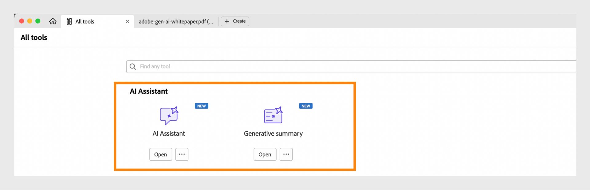 或者,在 Acrobat 主页中,选择所有工具,然后选择 AI 助手或生成式摘要工具。