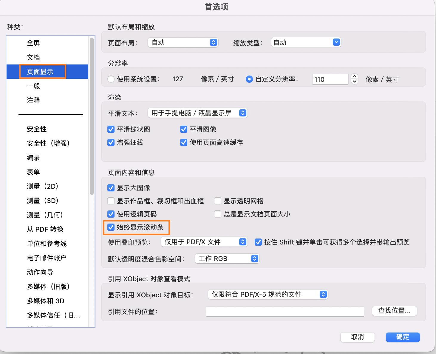 通过执行以下步骤,可使滚动条在 Acrobat 或 Acrobat Reader 中始终显示: