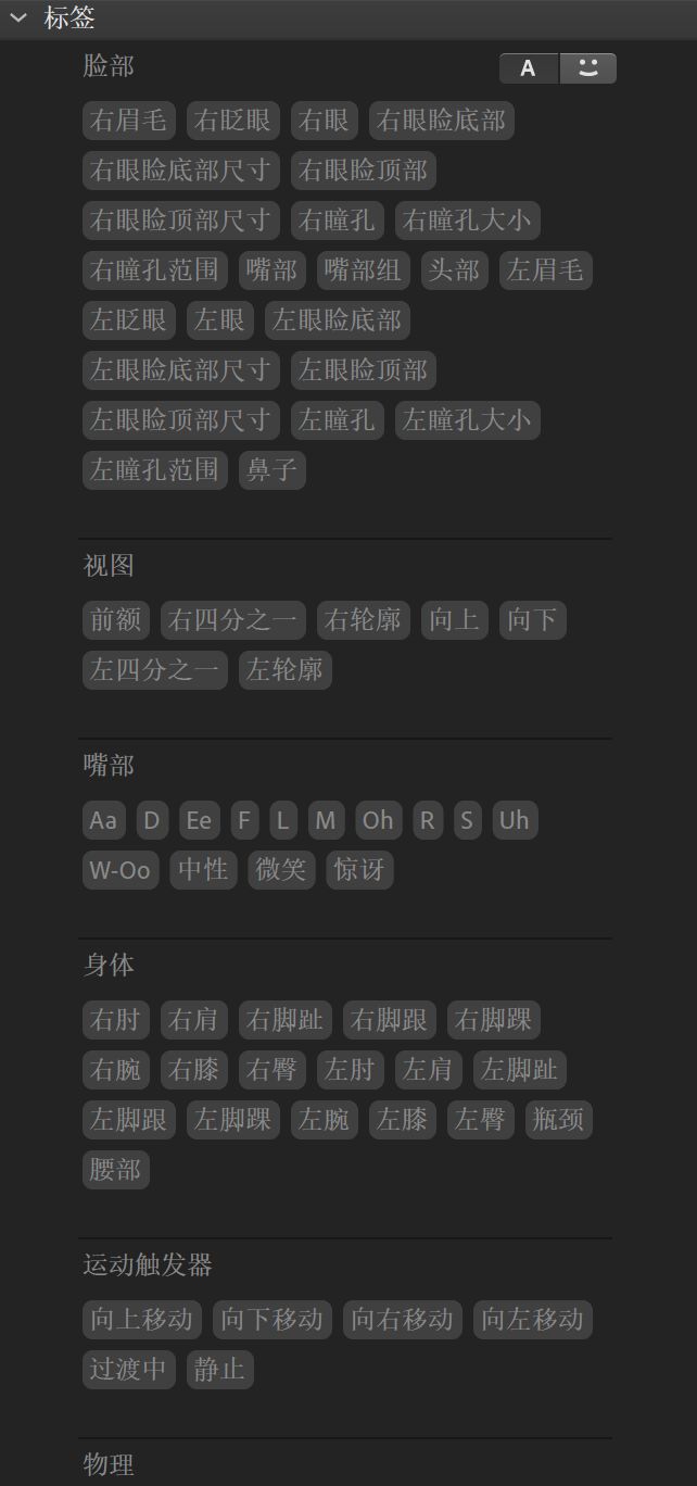 “属性”面板“标记”部分的布局让您可以更轻松地访问眼睛标记、按外观排序的嘴部标记,以及通过工具创建的标记的匹配图标(对于“销”工具是“固定”,对于“拖动工具”工具是“可拖动”,对于“摆动”工具是“摆动”)。“颌”标记位于“脸部”标记分类中。