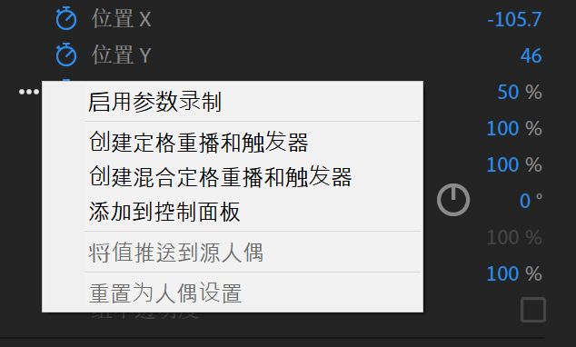 ) 图标,然后选择“启用参数录制”。启用后,参数旁边会显示一个红点。如果在录制期间修改参数的值,则会创建一个包含所有更改的新镜头。有关镜头的更多信息,请参阅录制镜头。当参数同时包含关键帧和镜头时,镜头具有优先性。