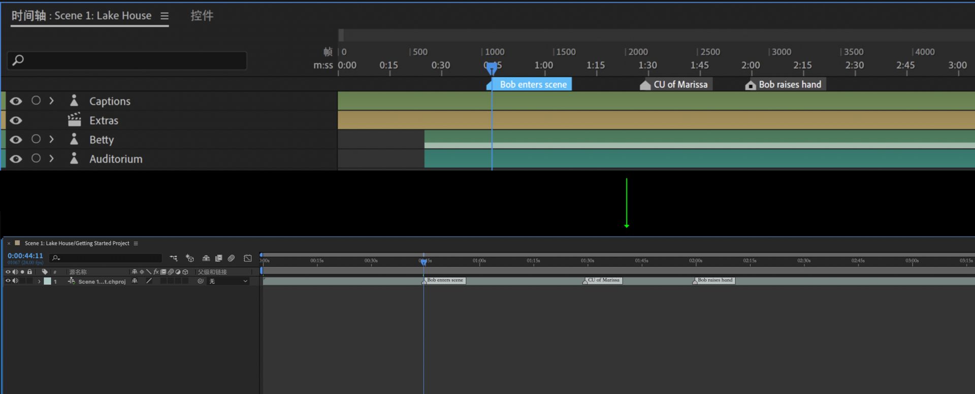 Character Animator 场景中的标记,在其他应用中显示为 Dynamic Link。例如,当您将场景从 Character Animator 的项目面板拖动到 After Effects 的项目面板时,这些场景的标记在 After Effects 中显示为合成标记。