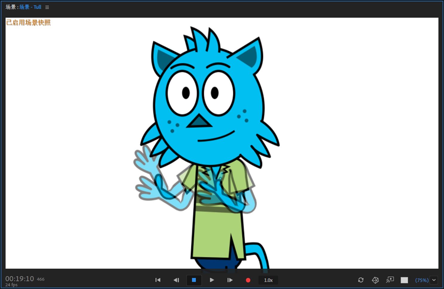 修改当前时间的姿势时,使用场景快照可以引用角色的特定姿势。例如,您可以比较或对齐角色镜头之间的手形位置。快照显示为洋葱皮。您可以显示或隐藏、更新并调整此显示相对于角色实时版本的可见性。如果场景具有相同的尺寸, 则快照 甚至可以出现在不同的场景中。