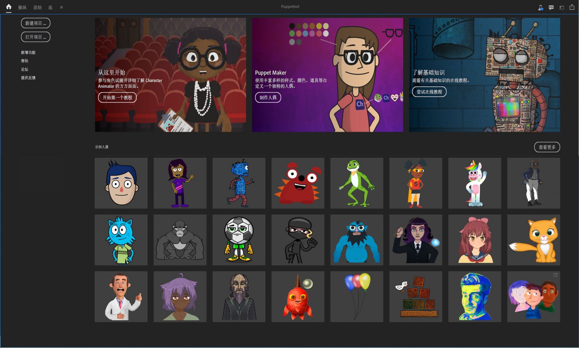 启动应用程序后,会显示主页屏幕。此工作区包含交互式快速入门视频教程、关于 Web 的有用资源和模板人偶等资源。可以使用这些资源来了解 Character Animator,或制作模板人偶的动画来开始练习。