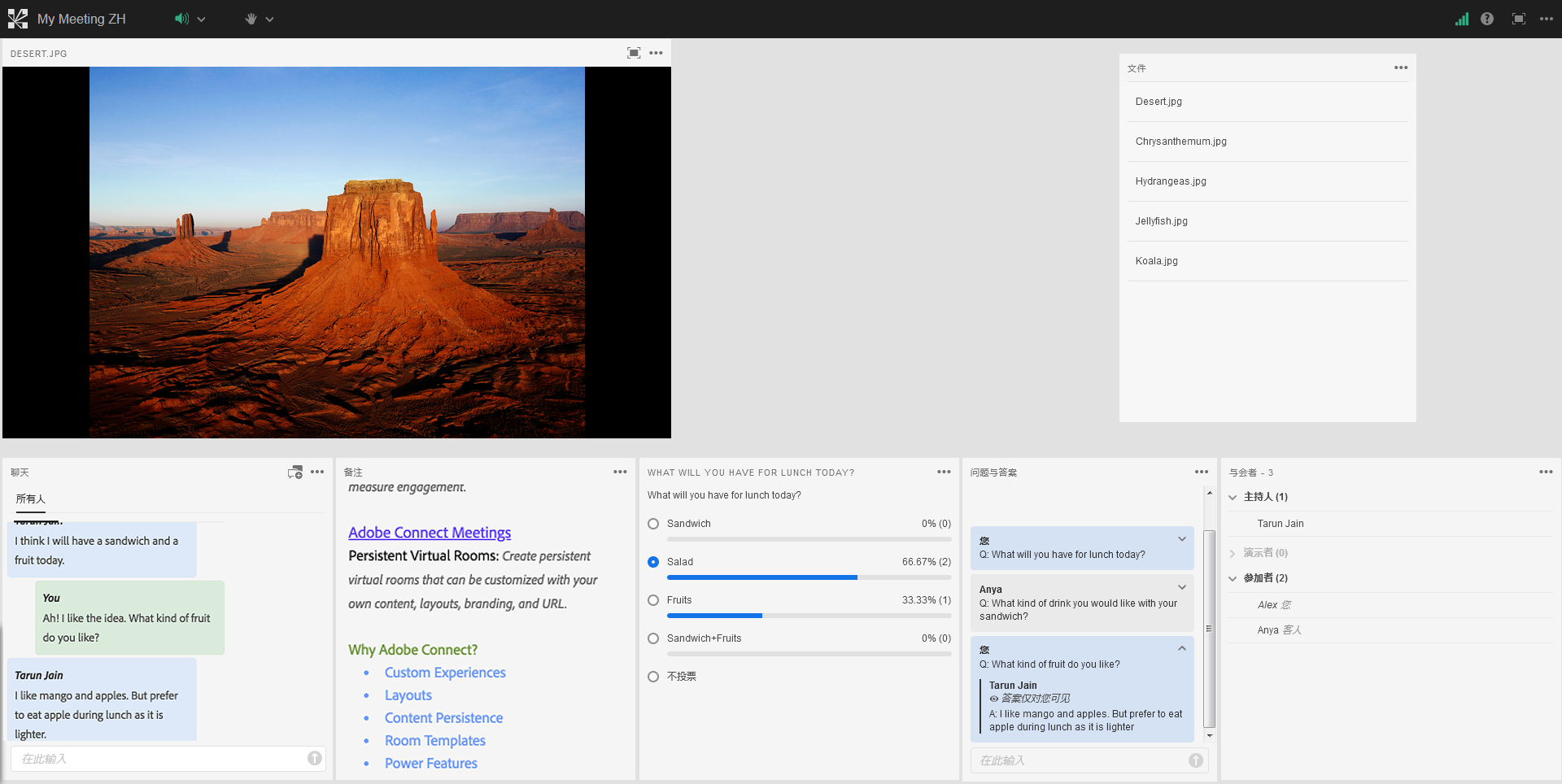 "Adobe Connect 的聊天窗口已得到增强,支持与会者标记,使会话期间更容易引导消息和吸引注意力。