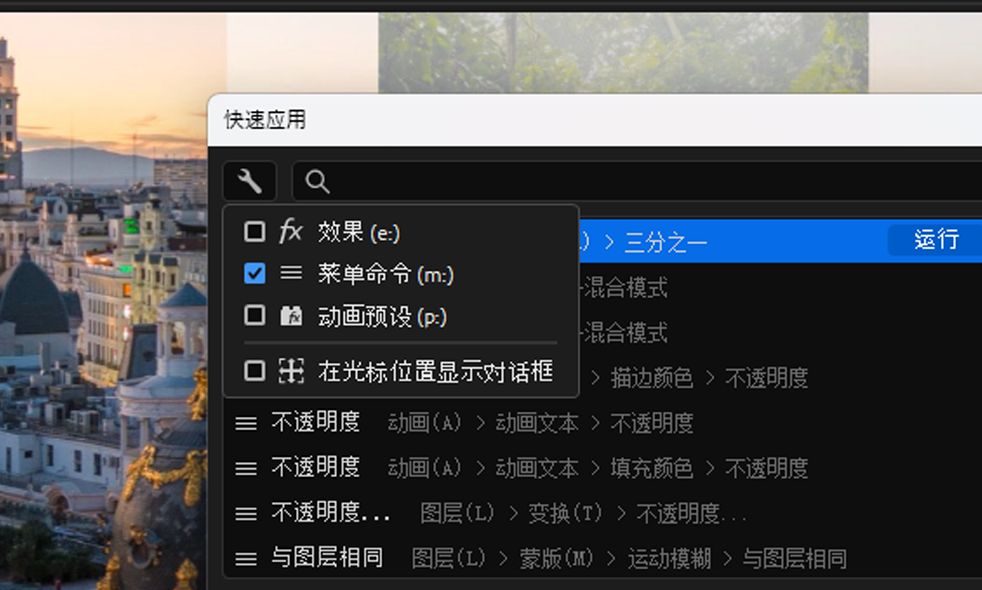 通过键入 m: 后跟命令名称来搜索菜单命令。 通过键入 m: 后跟命令名称来搜索菜单命令。 当您应用效果或预设,或运行菜单命令时,可以将它们应用到选定的图层、创建新图层或将它们添加为调整图层。