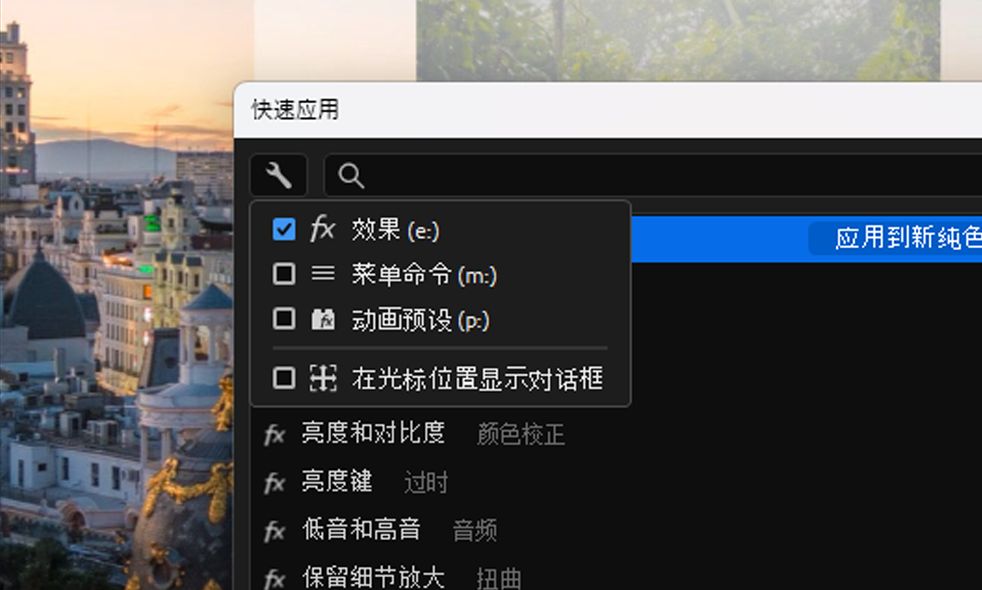了解如何使用“快速应用”在 After Effects 中搜索并立即应用任何效果、动画预设或菜单命令。