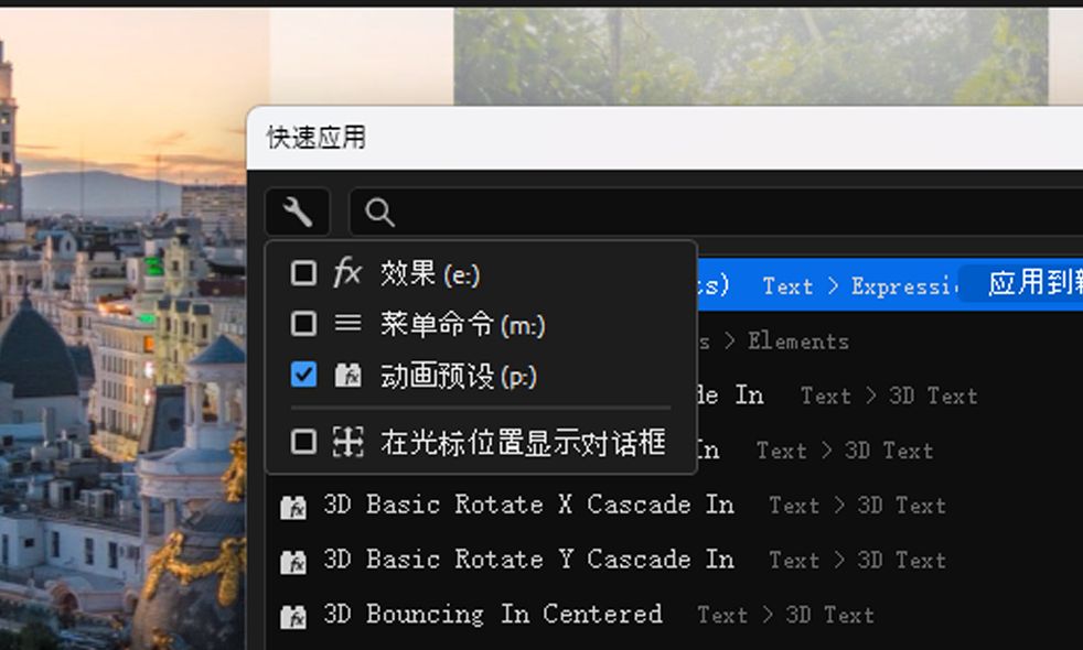搜索文本预设和其他动画预设以将其应用到选定的图层,或将其添加到新图层或调整图层。