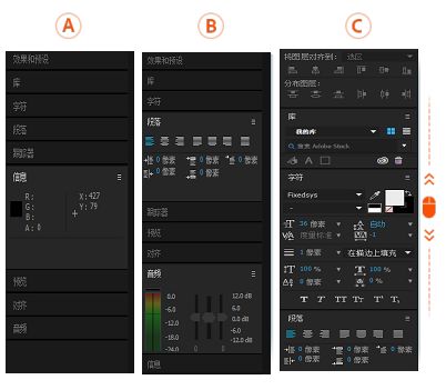 在堆叠面板组中,面板将最小化为选项卡并垂直堆叠。如果单击面板选项卡,面板则会展开。