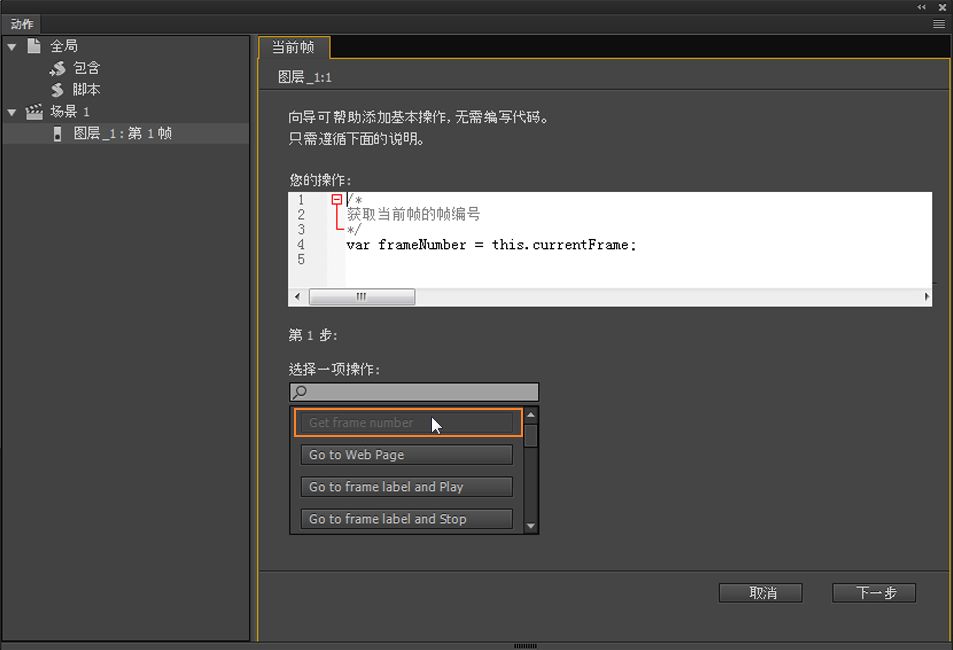 显示动作的动作代码向导选项的示例屏幕快照 显示动作的动作代码向导选项的示例屏幕快照 在上面的截图中,已选择“获取帧编号”动作,并且相应的代码已在“动作”窗口中更新。