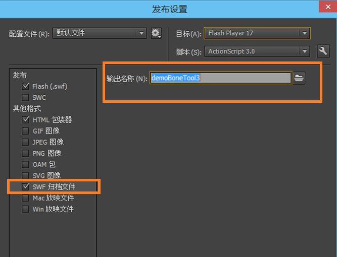 选择一个 ActionScript 文档 >“文件”>“发布设置”>“其他格式”>“SWF 归档文件”。