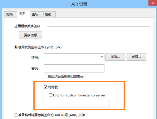 Animate 支持最新的时间戳服务器,并且配有一个为自定义时间戳服务器添加 URL 的选项。