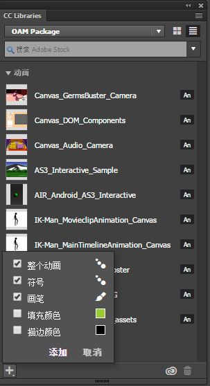 选择弹出窗口中的“整个动画”复选框,然后单击“添加”。所选动画实例将上传到 CC 库并标记为 An。