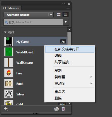 - 在新文档中打开:将选定的动画作为一个新文档打开。或者也可以将动画拖放到舞台。