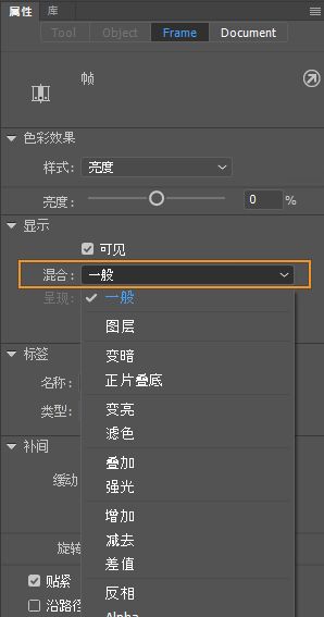在特定帧上应用混合模式, 首先 选择帧,然后在“帧属性”面板的“显示”部分下选择一个混合模式。