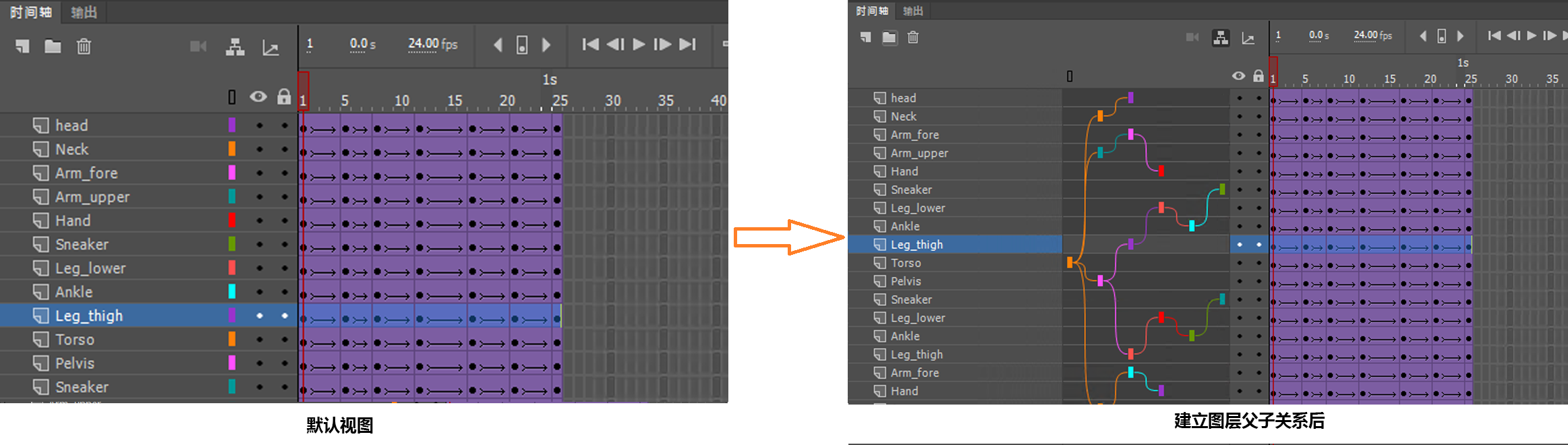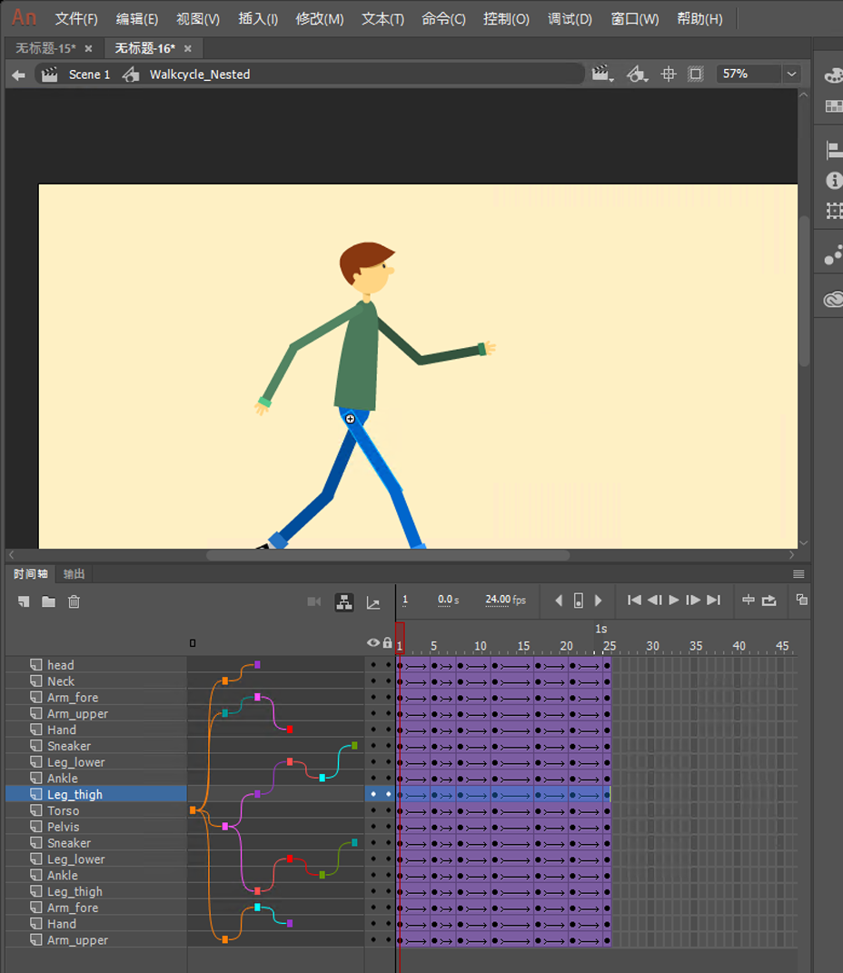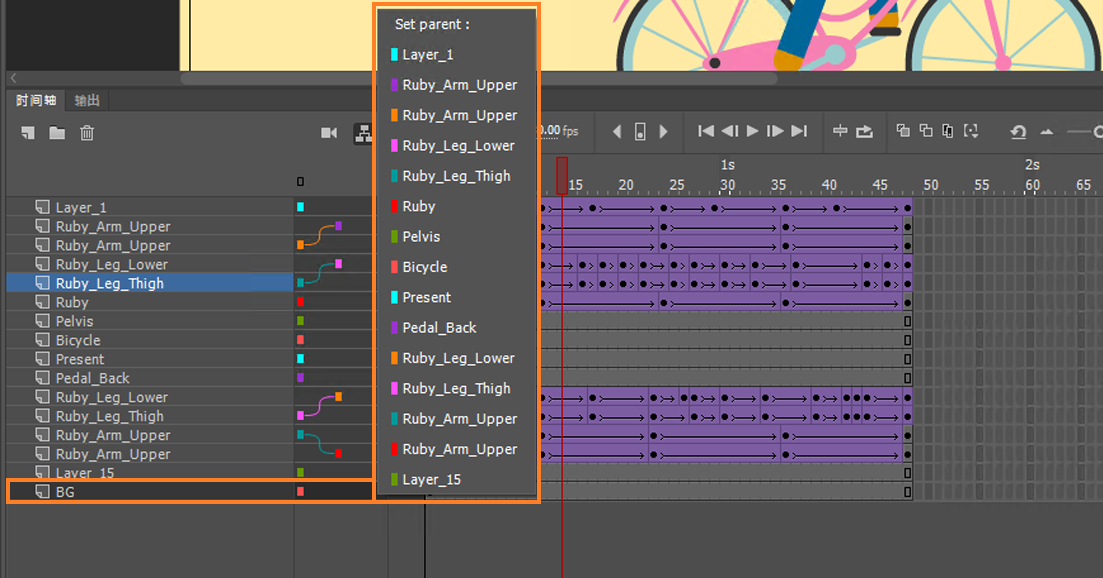 Animate 允许您将一个图层设置为另一个图层的父项。建立图层父子关系的一种简单方法是允许您动画的一个图层/对象控制另一个图层/对象。作为动画设计人员或游戏设计人员,您可以更轻松地控制人物不同部位的移动,从而加快您的动画时间。