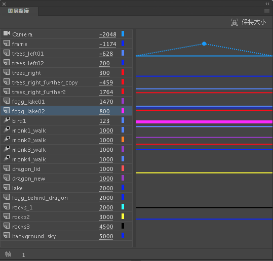 如上面的屏幕截图所示,图层深度值显示在指定帧的每个图层名称的旁边。