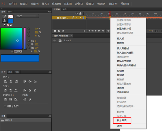 可以使用“分割音频”上下文菜单来分割时间轴中嵌入的流音频。分割音频允许用户在需要时暂停音频,然后在时间轴中后面的某帧处从停止点恢复音频播放。