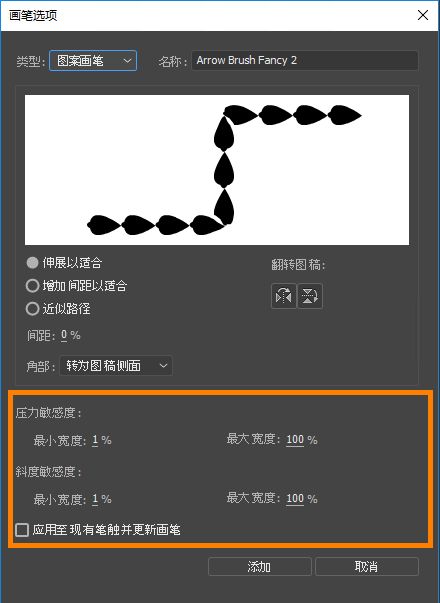 单击“添加”,添加具有选定压力和斜度敏感度设置的新画笔。