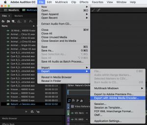 在 Audition Multitrack 时间轴中,选择文件 > 导出 > 使用 Adobe Media Encoder 导出。
