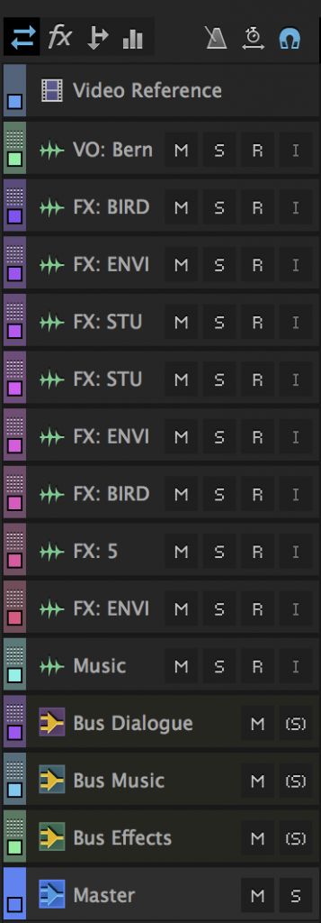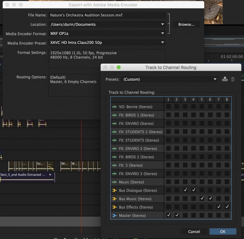对于这种情况,您可以使用标准的音频轨道,每条轨道都通过单独的对话、音乐和 FX 总线传送。这不仅允许您在操作过程中打开和关闭作品的特定元素,还可以让您在 AME 导出过程中,将每条总线的输出分配到各个声道。为何这如此重要?因为许多广播公司使用 MXF 之类的格式,而不仅仅是播放视频。除了声音效果、音乐和完整的英语混音音频之外,您还可以处理其他语言音轨(例如西班牙语或法语),播放系统会清楚广播目标所对应的传送声道。