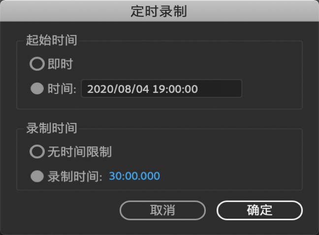 定时录制对话框 定时录制对话框 - 开始时间:您可以修改开始录制的时间和日期。默认情况下,“开始时间”配置为自其调用时间起 15 分钟后。您也可以通过选择“即时”立即开始录制。