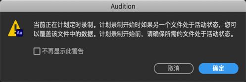 注意:在此期间,建议不要执行其他编辑工作。尝试打开或切换到其他文件时,系统会提示您显示定时录制的警告,如下所示。Audition 将在 "编辑器" 面板中的任何一个文件处于活动状态时开始录制,因此为了避免覆盖数据,建议在等待录制时让 Audition 保持空闲。