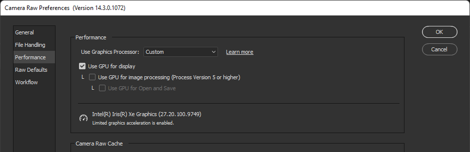 - 在 Camera Raw 首选项的性能面板中,使用图形处理器下方显示图形加速由于出错而遭到禁用。