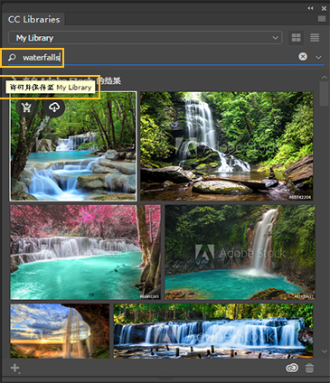 Adobe Stock 与 Creative Cloud 库紧密集成在一起。您可以通过下列方法之一搜索图像并将其添加到您的任意一个 CC 库中: