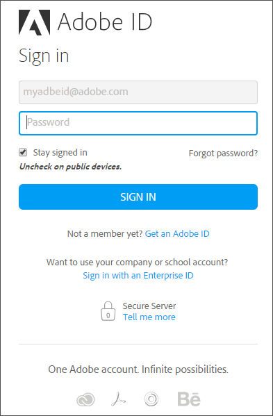 设备上将出现一个登录屏幕。使用您的 Adobe ID 凭据登录。确保使用的 Adobe ID 就是用于 Dreamweaver/Creative Cloud 的同一个。