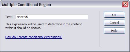 您可编写一个简单的条件表达式并将它插入到 XSLT 页面中。打开“条件区域”对话框时如果选定了内容,则内容将包括在 <xsl:if> 块中。如果未选择内容,<xsl:if> 块将添加到页面中的插入点处。建议从使用此对话框入手,然后在“代码”视图中自定义表达式。