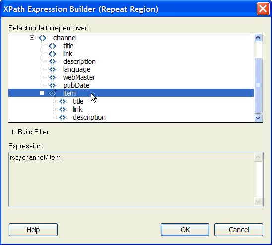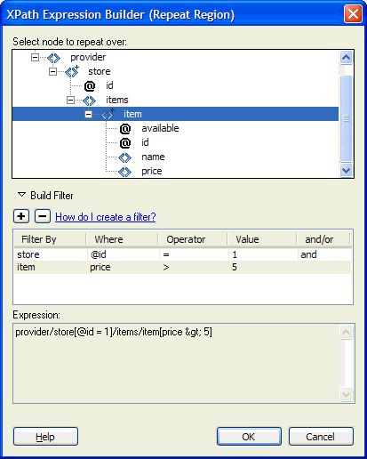 可选择节点以重复和筛选(可选)结果。在“XPath 表达式创建器”对话框中,您所选的内容将会包含在 <xsl:for-each> 块中。如果您未选择内容,<xsl:for-each> 块将输入到光标所在的插入点处。