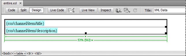 7. 如果适用,将重复区域 XSLT 对象添加到包含 XML 数据占位符的表格或表格行。
